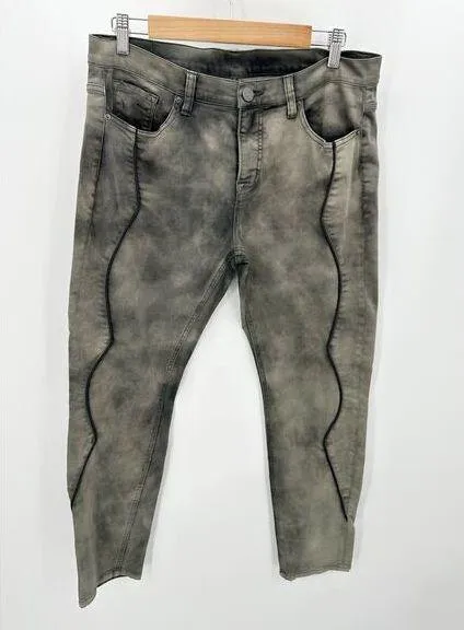 Grey and green tie dye Mid Rise Twig Ankle denim jeans. Button closure, pockets, belt loops. Cotton... Show more