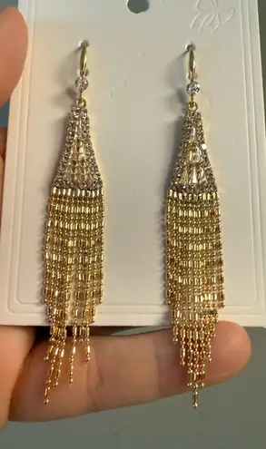 Stunning gold tone tassel drop earrings with sparkling rhinestone accents. These glamorous statement earrings feature cascading gold chain details with crystal embellishments that catch the light beautifully. Perfect for parties, special occasions, or adding a touch of sparkle to your everyday style. • Color: Gold tone with clear rhinestones • Drop length: approx. 3.5” • Lightweight and comfortable • Condition: NWT ✨ A must-have accessory for any jewelry lover! A