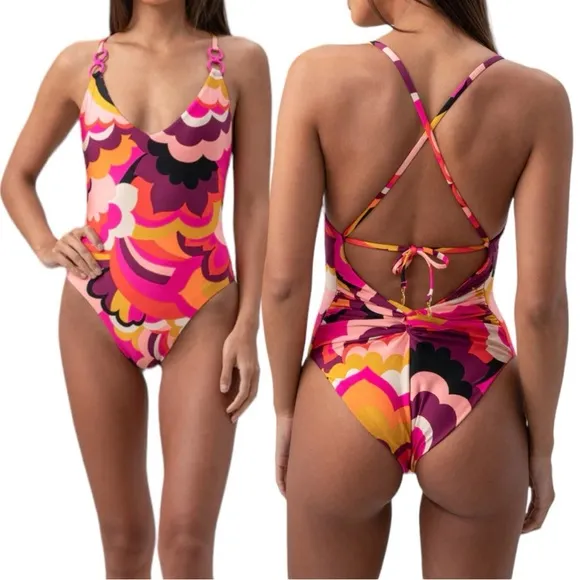 This one-piece maillot swimsuit features a low V neckline, adjustable, multi-way halter straps, twis... Show more