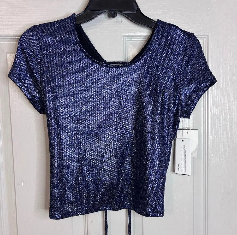 Brand new with tags (NWT) Guess Sidra Shine Top in size Large. A stunning blue glitter crop top with... Show more