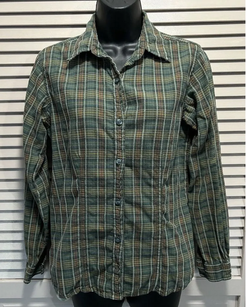 This Woolrich vintage flannel shirt is a must-have for any cowgirl or cowboy enthusiast. With its green, orange, and yellow plaid pattern and collared neckline, it's perfect for any occasion, whether it's casual wear, workwear, or even travel. Made from 100% cotton woven fabric, it's lightweight, breathable, and easy to care for, making it suitable for all seasons. The shirt features a button-up closure and long sleeves with casual sleeve types. It also has pockets for added convenience. The size is adjustable, with a pit to pit measurement of 18.5 inches and a length of 24 inches. This shirt is a regular fit and is machine washable. Add this classic and colorful shirt to your wardrobe today! (1409)