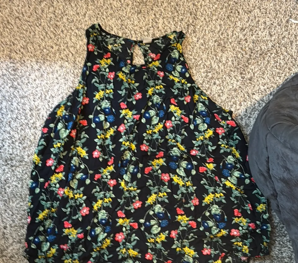 This stylish sleeveless top features a vibrant floral pattern on a black background. Perfect for any... Show more