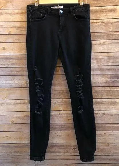 Zara Trafaluc Denimwear black distressed skinny jeans with bottom zip details. Size 8. Measures ap... Show more