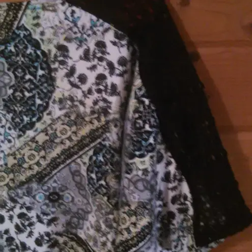 This is a Bleeker and McDougal blouse with black netting on the shoulders contrasted with an artistic printed pattern for the base. The base color is white overlayed with various shapes and floral arrangements accented with blue, green, gray, and black. The material for the shirt itself is 95% polyester and 5% spandex, very smooth and soft. The netted material is 100% polyester. The pit-to-pit ratio is 20 inches while the length from shoulder to bottom is 24 1/4 inches. The size is labeled as PL, and I would call it medium to large size.