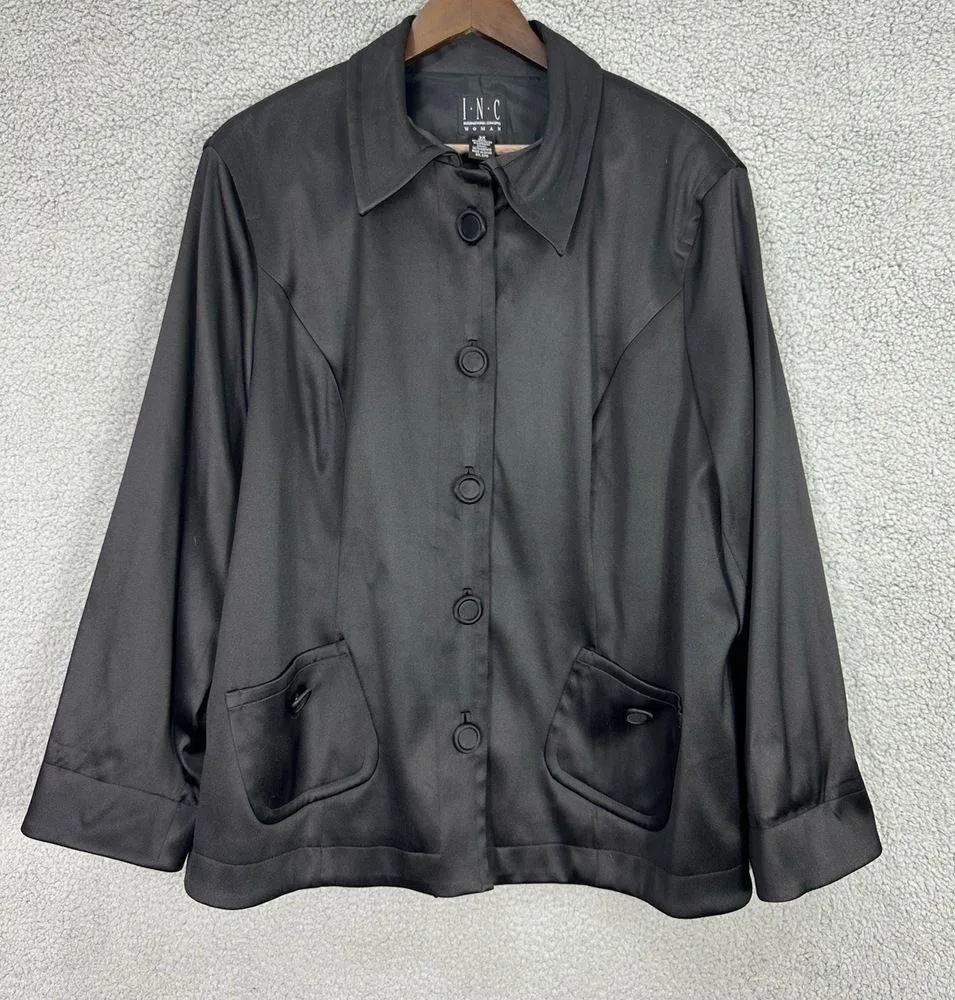 I.N.C. International Concepts Black 5-button Collared Front pockets Casual Jacket 3X Embrace retro style with this unique women's black satin jacket. With its 5-button front and collared design, it brings boho glam vibes to any outfit. Front pockets add function to fashion, and its minimalist artsy appeal makes it a must-have piece for all occasions. Condition: Good condition. Size: 3X Features: Black, 5-button, Collared, Front pockets, Retro Brand: I.N.C. International Concepts Type: Jacket Style: Casual Color: Black Material: Shell: 96% Polyester, 4% Spandex; Lining: 100% Acetate Measurements: See pictures. Tags: INC, Jacket, Black, Satin, Womens, 3X, Retro, Collared, Boho