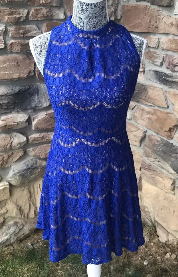 Stunning blue lace sleeveless dress ~ fit & flare style ~ fully lined in nude material ~ EUC Perfect for wedding or bridesmaid or bridal shower or a night out! Approx length 34” pit to pit 17”