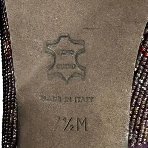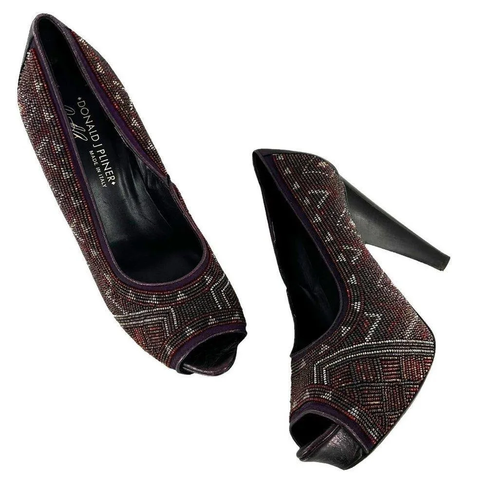 Donald J. Pliner CECI Purple Beaded Peep Toe Platform Heels Chic and funky platform heels in purple/multicolor geometric beading. Features: Peep toe 1" high platform 4.5" tapered stacked wood heel Leather lining and sole Size 7.5 M Excellent condition with very little wear.