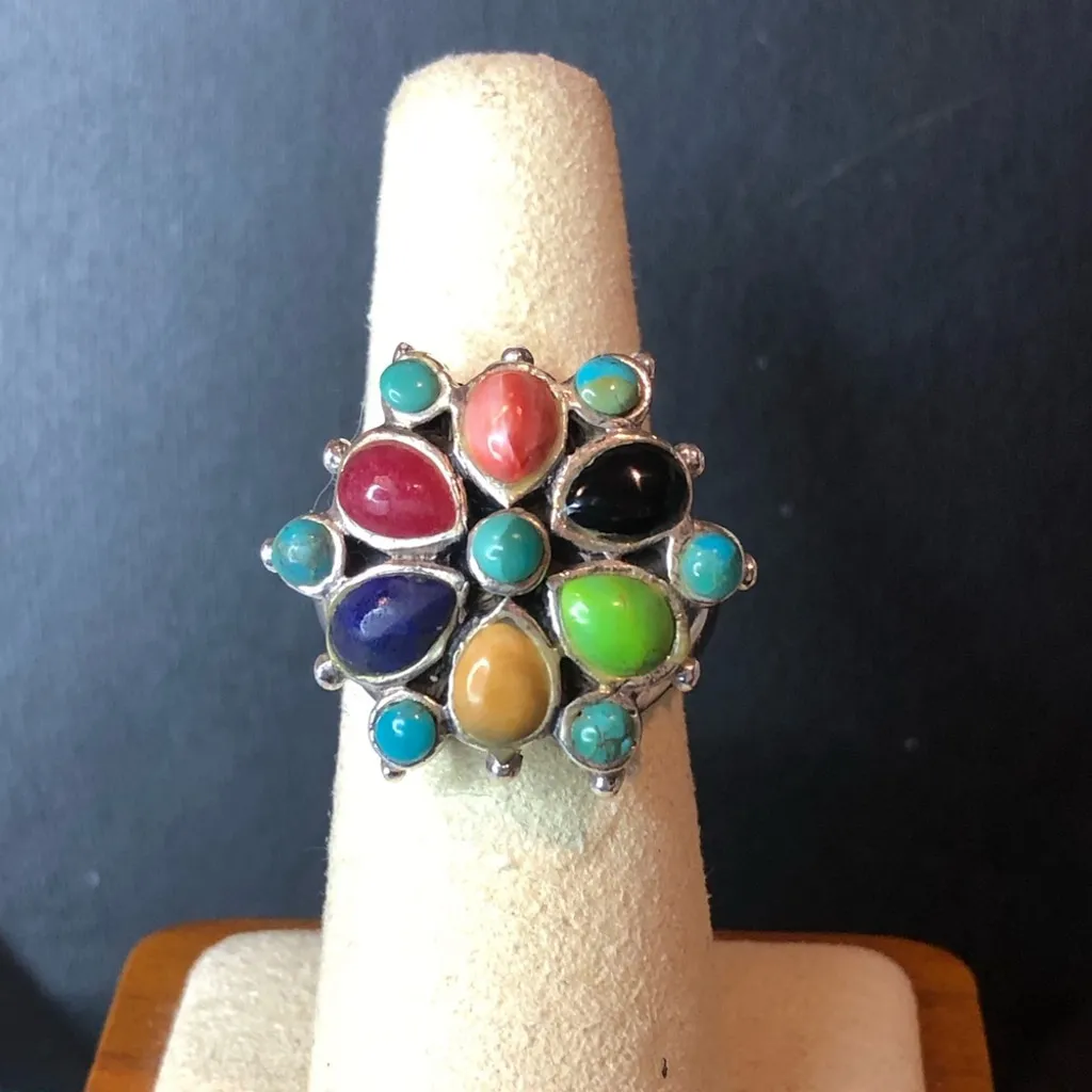 BARSE Multi-Gemstone Sterling Silver Ring SIGNED: BARSE, 925 COMPOSITION: Sterling Silver, Cabochon Multi Gemstone Inlay Ring Turquoise, Lapis Lazuli, Coral, Onyx, Spiny Oyster, Green Turquoise Sizes: 7-1/4, 8 Other Pieces In Collection Shown Here And Offered Separately Colors May Vary Based On Shadows, Lighting, Monitor, Display Settings Ask Questions and/or Request Additional Photos, Measurements as Needed Photos of Measurements are Available in The Slides No Returns, No Exchanges, No Trades, No Cancellations, No Accidental Bids ALL PHOTOS, DESCRIPTIONS, INTELLECTUAL PROPERTY ARE COPYRIGHT PROTECTED. ALL LEGAL RIGHTS RESERVED AND PROTECTED BY DMCA AND WILL BE LEGALLY ENFORCED.