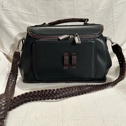 This crossbody bag features a sophisticated mix of dark brown crocodile-textured leather and smooth black leather, accented with silver-toned hardware. Its structured design and braided leather strap provide a stylish and functional accessory for any occasion. Middle zippered compartment. Zippered pouch on back wall of purse. Removable strap. Back of purse has an attached wallet with coin purse and numerous storage slots. Flaw on one of the back zipper pulls (pictured)