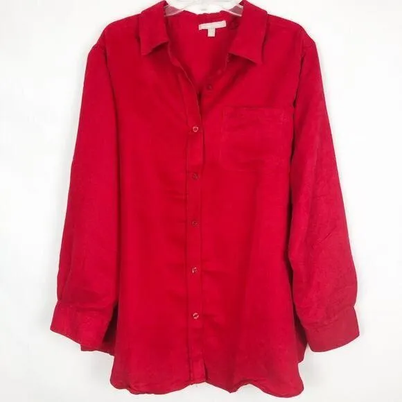 Woman Within Suede button down red shirt. Collared. V-neck. Button down. Long sleeves. Buttoned cuff... Show more