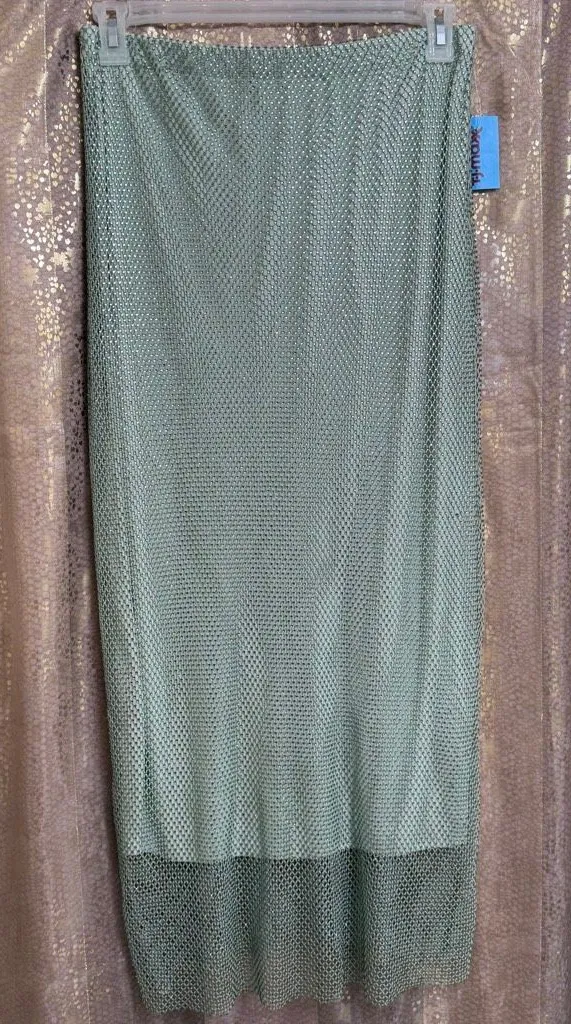 Brand new with tags, smoke and pet free home. No flaws; I did notice that at the seam of the skirt there is less rhinestones but I think its supposed to be that way. See photo 6. This is really a stunning piece, you will turn heads in this. Gorgeous light sage green color. This is like mid weight, not heavy but not lightweight. Does not feel cheap. Beautiful for a date, party, concert or special occasion. Lined Elastic waistband 100% Polyester Waist laying flat across approx: 15” Top to bottom hem length approx: 39”