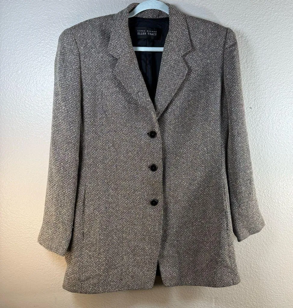Sophisticated Linda Allard /Ellen Tracy blazer in textured gray. Ideal for both office and casual wear. Features a classic three-button design and side pockets. Size:12 Color:Gray Materials:Silk-Rayon-Nylon-Linen Approx.Measurements. Pit to pit:21” Length:37” Conditions: Preowned EUC.