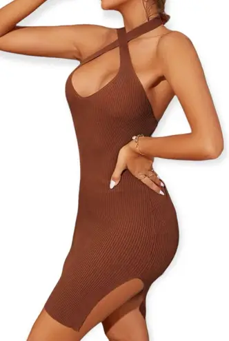 Features: Criss Cross Halter Neck Side Slit Ribbed Knit Stretchy Open Backless Bodycon Fabric: Vis... Show more