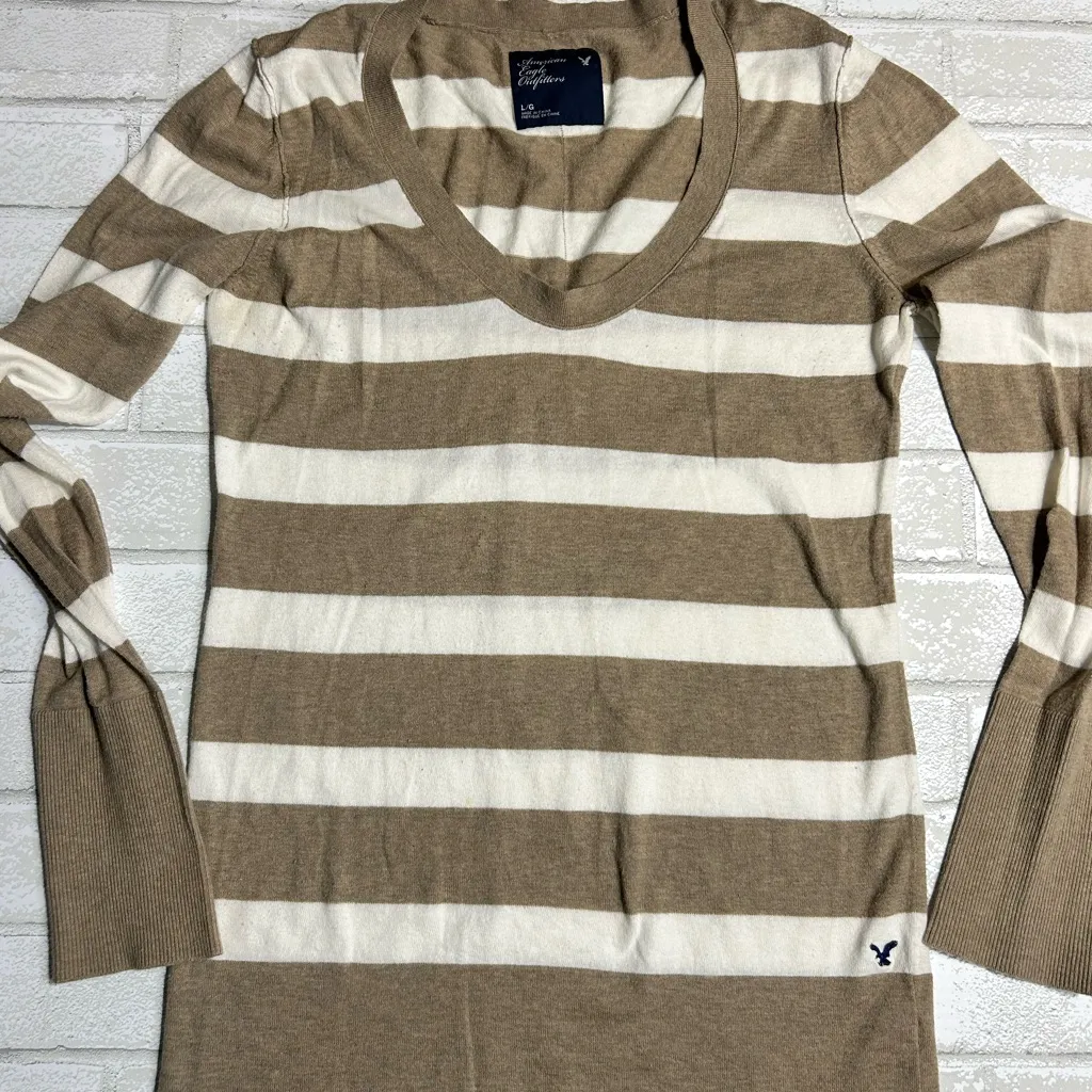 Chic knit top with tan and white stripes. Ideal for everyday style. American Eagle Y2K striped swea... Show more