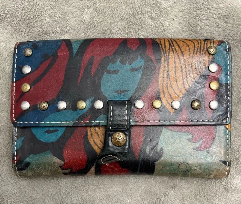 Patricia Nash Studded Leather Floral/Faces Trifold Wallet This Patricia Nash leather tri-fold wallet exudes timeless style, crafted with quality leather that has developed a beautiful patina over time. It shows signs of wear, including gentle creasing and a slightly curled front tag, adding character and charm. Despite the wear, the wallet remains functional and holds its classic appeal, with plenty of room for cards, cash, and coins. It’s a versatile accessory that combines practicality with a touch of vintage elegance.