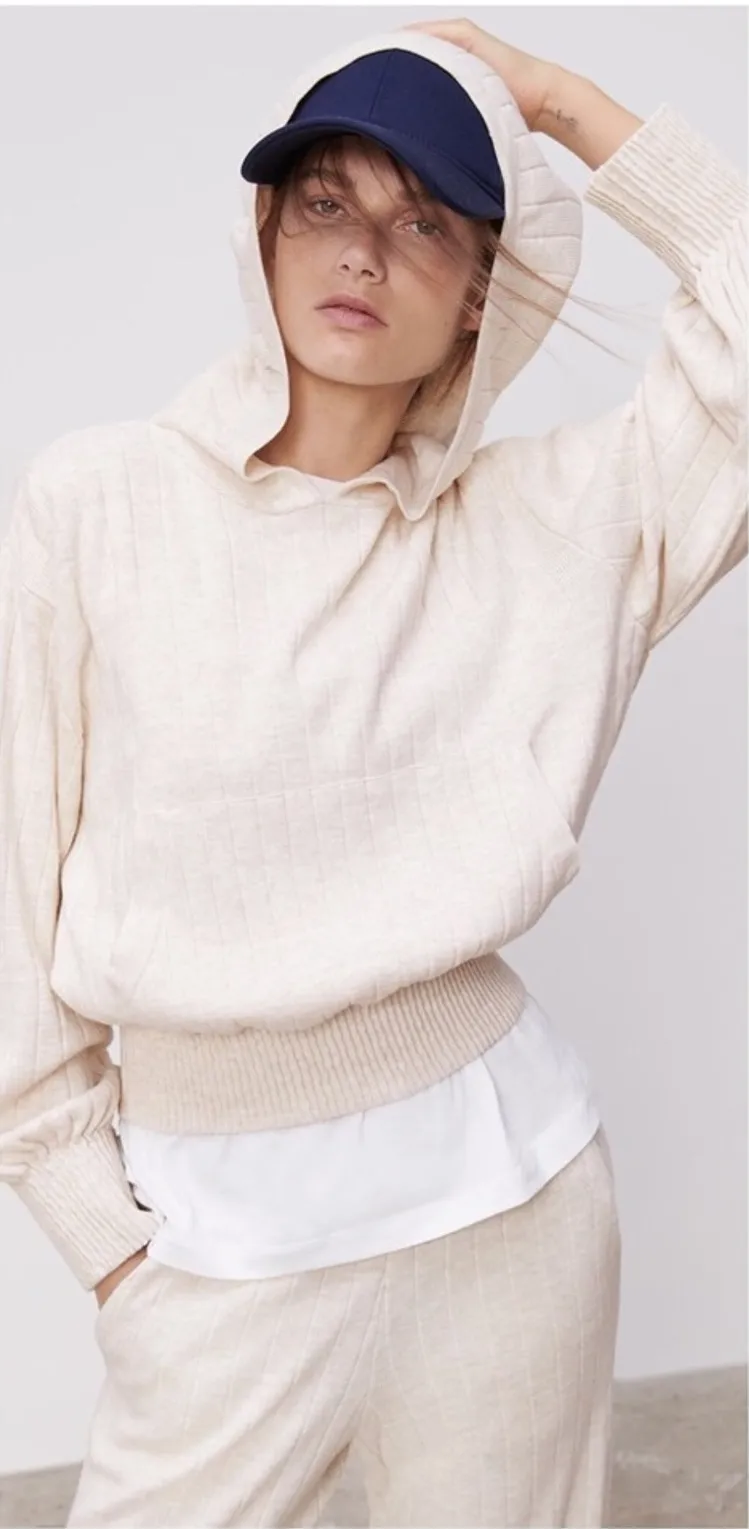 Zara Cream Cropped Knit Ribbed Hoodie Sweatshirt Medium Like new no flaws! Cream oatmeal color... Show more