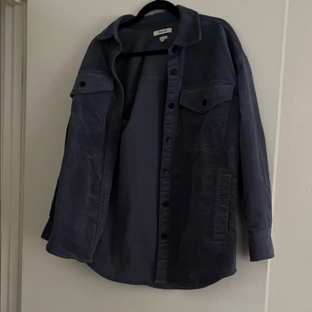 Stylish dark blue button-up shirt jacket. Features front pockets and a classic collar. Corduroy mate... Show more