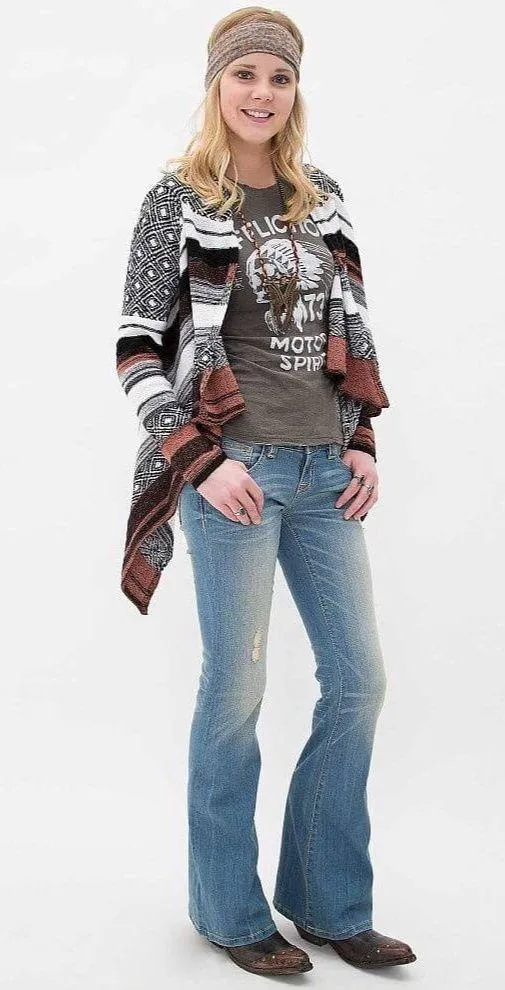 BKE flyaway knit cardigan sweater with stripe & geometric design. Open front with draped sides. Open... Show more