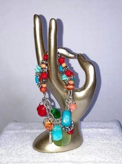 Vibrant bracelet featuring a mix of orange, green, and turquoise colored beads. Chain side is silver-tone with silver-tone charms and acrylic stone-like beads. The other side of the bracelet is made of acrylic beads in varying colors and stretches. This beauty will fit a size 7 wrist with stretch to fit a 7 3/4 without cord showing.
