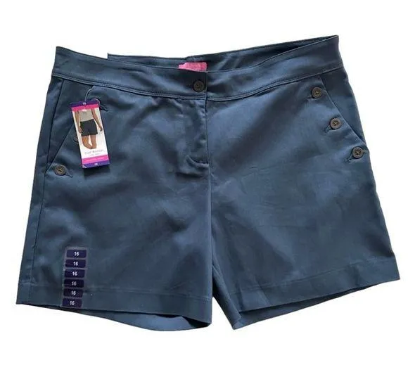 Issac Mizrahi New York Slate Blue Tailored Button Accents Stretch Shorts Size 16 NWT Features: Slate blue- tag says Vintage Blue Tailored High Rise Button details in front pockets Back welt pockets Belt loops Stretch Button zipper closure Extra button attached to fabric label Measurements approximate laying flat: Waist: 20” Rise: 11.75” Inseam: 6” (tag says 5” but measures 6”)