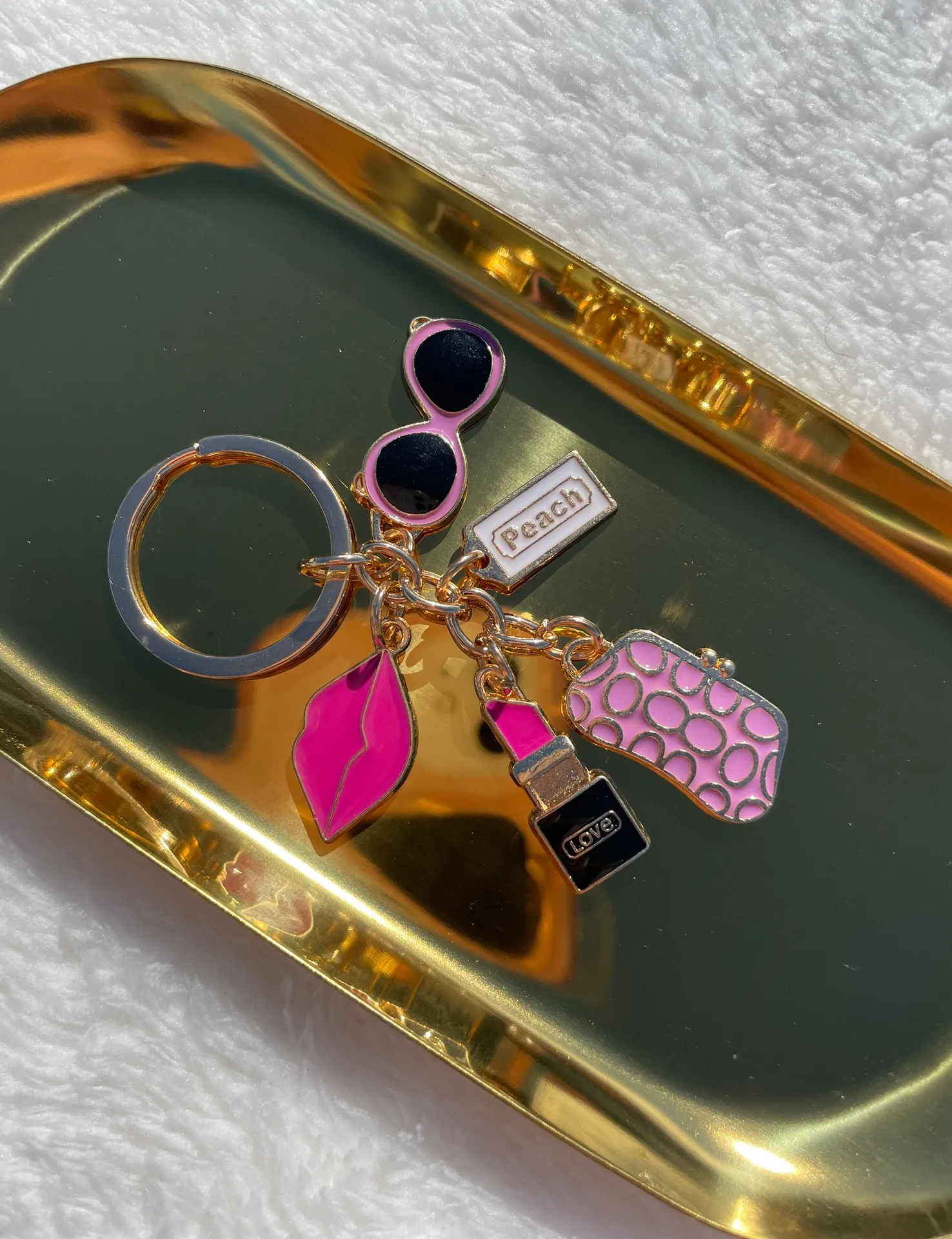 ♡ NEW / Comes in mesh bag ♡ Pink Dangling Lipstick, Coin Purse, Sunglasses, Tag, & Lips Accessory Charms ♡ Gold Keyring & chain ♡ Reminds me of coach ! ♡ Keychain Size - Height: 2 inch, Length:2 inch, Width:2.8 inch *purse not included*