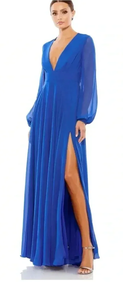 Mac Duggal Blue V-Neck Illusion Long Sleeve Chiffon Gown, 55682, Size 6 (NEW) - $125 - From Alissa