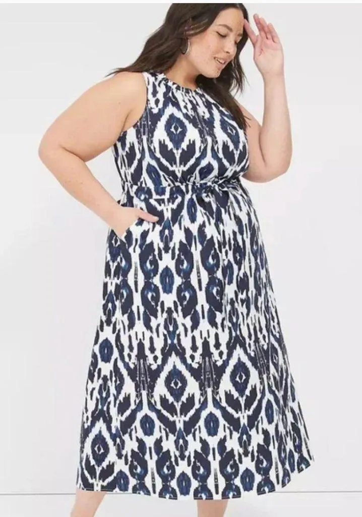 Great condition. Lane Bryant. Elastic-neck tie-waist midi dress. Which with navy blue geometric patt... Show more