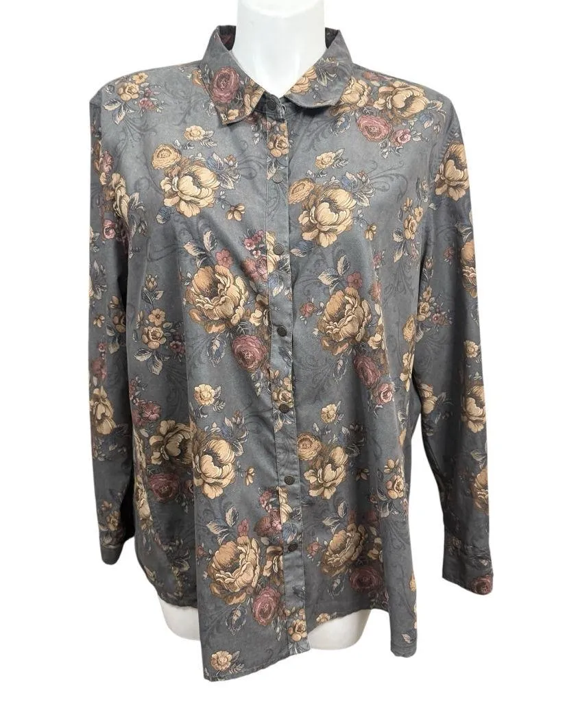 This pre-owned Natural Reflections women's long-sleeve button-down shirt is size 3X. It features a grey background adorned with an all-over floral print, showcasing large beige, brown, and pink/mauve flowers with subtle green and blue leaf accents. The shirt has a classic collar, a full button-front closure, and buttoned cuffs. The visible tag indicates the material is 100% polyester. The top is in good condition. Approximate lay flat measurements: Pit to Pit: 25 Length from top of shoulder to bottom of shirt: 30.5”