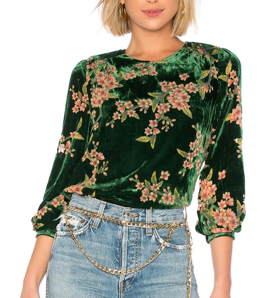 J.O.A. Velvet Burnout Floral Top in the color Green with pink floral details. Velvet burnout fabric.... Show more