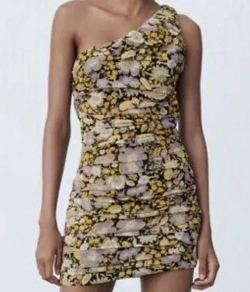 Zara One Shoulder Floral Ruched Mini Dress Purple Yellow Short. Bodycon mini dress by Zara featurin... Show more