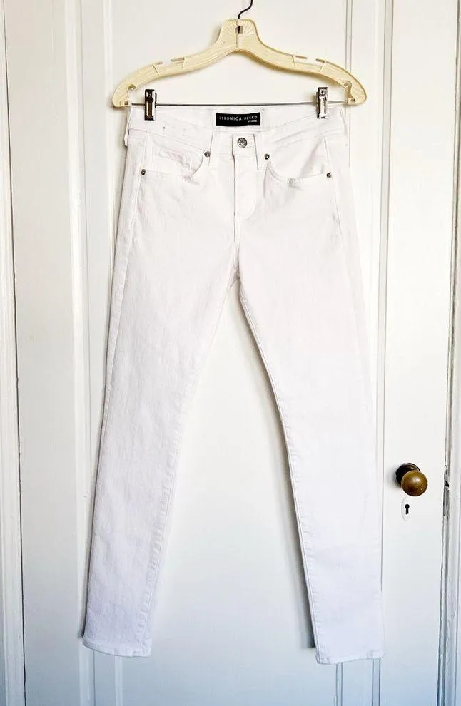 Classic white skinny jeans by designer Veronica Beard. “Brooke Skinny” style in white stretch denim. Mid rise. 91% cotton, 7% polyester, 2% polyurethane. Waist 28.5-30.5“, rise 9.25“, inseam 28.25“. Size 26/2, great preowned condition, very minor pucker at crotch (see photos, not visible when wearing). All measurements taken with garment lying flat & doubled where applicable. From the Veronica Beard website: "The Brooke features a mid-rise silhouette that is fitted through the hip and thigh with a skinny leg. We use the highest quality stretch denim, which means our jeans have the most flattering fit and a quick recovery. Thanks to our Secret Skinny Pockets, this is the best you've ever looked in jeans. The pocket construction utilizes stretch fabric for a slimming effect that will ensure a perfect fit.”