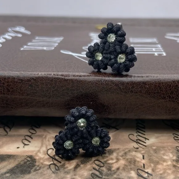 1970s Vintage black Floral cloth and rhinestone earrings. This listing is for a unique and rare find of vintage floral screwback earrings. These earrings are in good condition and are one of a kind, pair with a dress and heals for a trendy look! These are roughly the size of a nickel. These earrings are perfect for the woman who loves unique floral finds, one of a kind pieces, and wants a piece of Jewelry that is a piece of history that can paired up with almost anything! Remember to bundle and save in my shop, I have generous discounts on two or more items. With a ton of unique and handmade Jewelry, and clothing you can bundle an outfit and accessorize for a steal of the price. ❤️