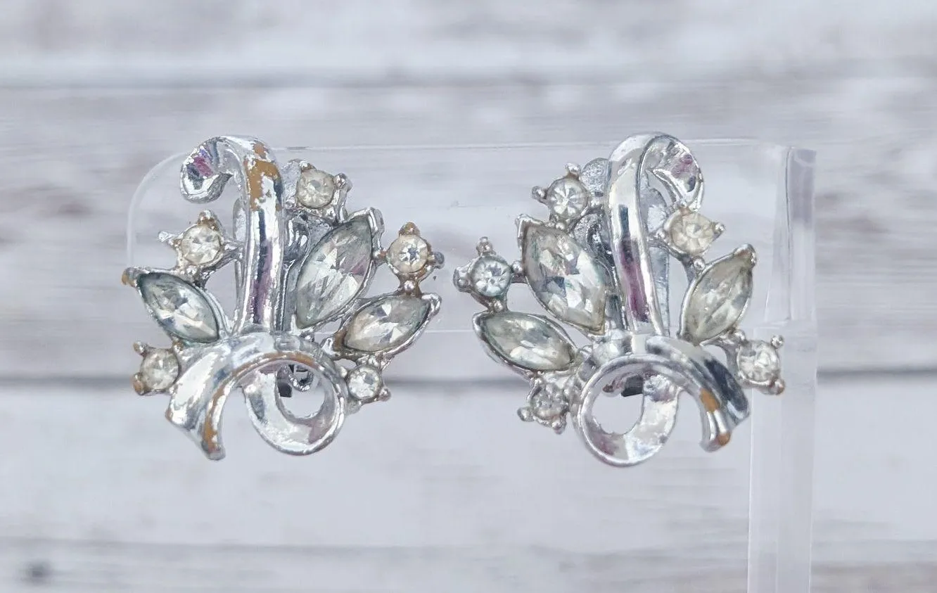 These earrings measure just over 1". Heavy silver tone chipping to front and rear. I am unsure of the material of the gems but there are none missing; however, some have clouded/yellowed. Preowned vintage earrings, sold as shown - I am unsure of material type(s) because of this. Pictures show different angles for you to review - while I attempt to note any defects, some tarnish/signs of wear may be visible that are not otherwise stated. Earrings are tested and photographed on a thin/smooth earring stand (not included) to show that the clips are in working order. If you have any questions please feel free to drop me a message.