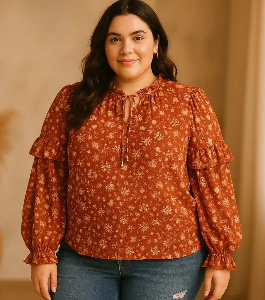 Black Tape Rust Floral Ruffle Boho Blouse Sheer Swiss Dot Peasant Top Fall Tie high neck, ruffle on balloon sleeve, semi-sheer **The model photo is computer generated. Please look at all photos for accurate details** Pre-owned condition, please see photos, several loose thread Size 2X 100% Polyester Approximate measurements in inches: Pit to pit: 25 Shoulder to hem: 26 Sleeve length (from underarm): 16.25 Boho Fall, Cottagecore, Feminine Romantic, Vintage-Inspired, Peasant Blouse, Floral Chiffon, Ruffle Neck, Poet Sleeve, Indie Boutique, Autumn Rust, Layering Top, Sheer, Ruffle, Tie Neck