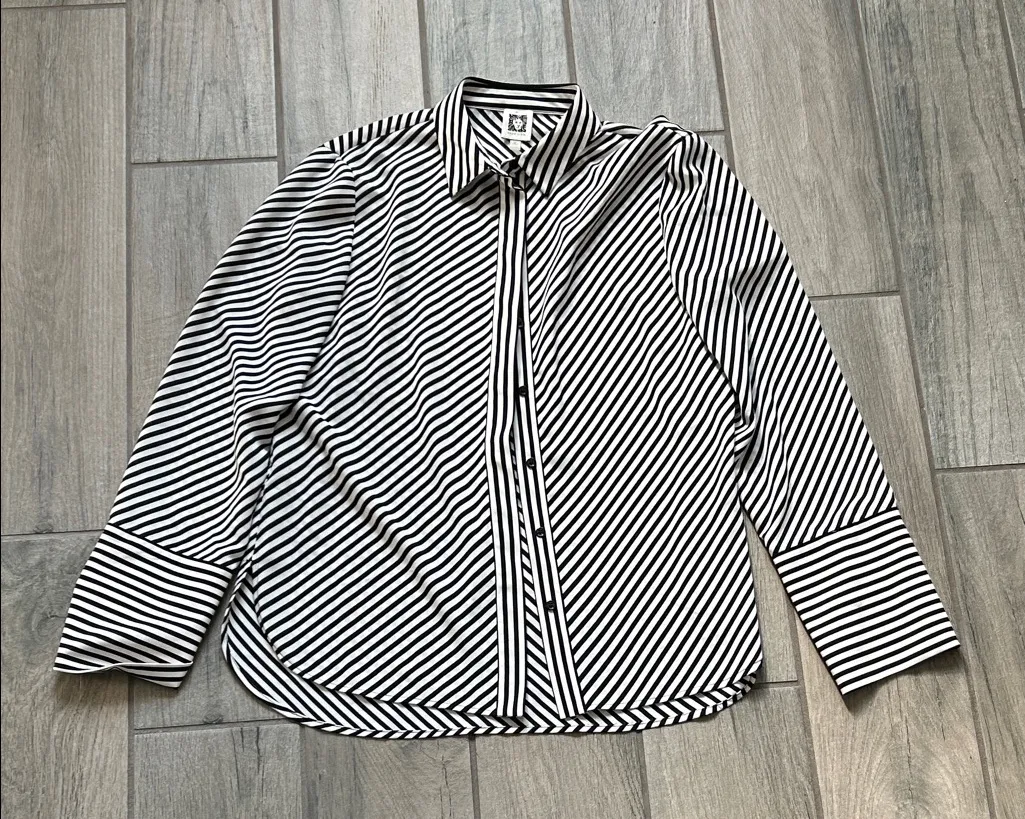 Chic diagonal striped design. Classic button-down style. Perfect for casual outings.