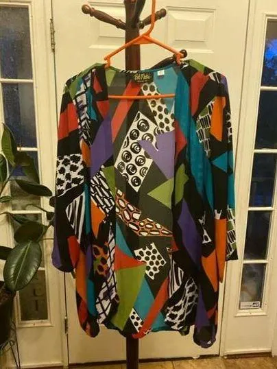 This is a beautiful vintage Bob Mackie kimono. It is made of a lightweight, silky fabric and features a colorful geometric print. The kimono is open front with 3/4 length sleeves. It is in excellent condition and has never been worn.