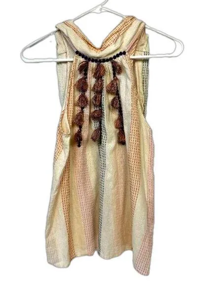 Beautiful Summer top with a high neck and tassels on the front, and buttons & a tie in back. Gorgeou... Show more