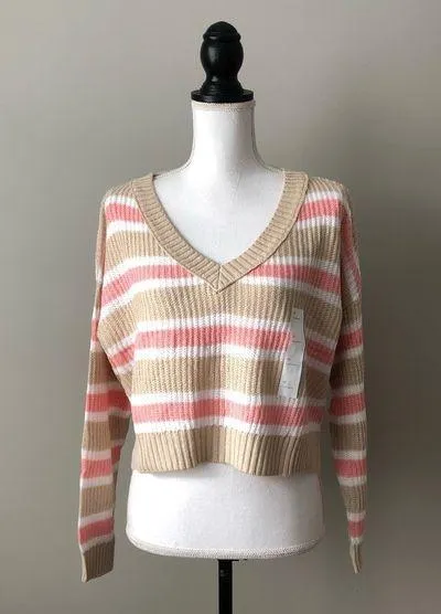 NWT WILD FABLE | Striped V-neck Cropped Sweater. V-neck pullover style. Tan, white pink stripes. M... Show more