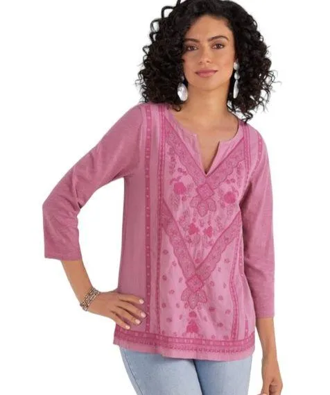 Soft Surroundings Women’s Coconut Dreams Embroidered V Neck Tunic Top Shirt size XS Button cuffs 3/4 sleeves Curved hem Approximate measurements: 17” pit to pit, 24” long Shirt, top, tunic, embroidered, women’s, ladies, boho, v neck, soft surroundings, bohemian