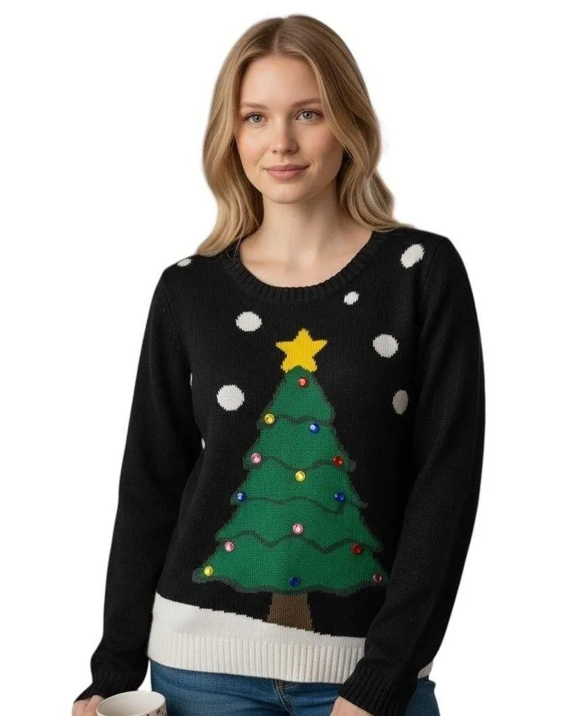 Brand: Carolyn Taylor Item: Womens holiday sweater with crewneck and long sleeves Design: Black knit with a green Christmas tree graphic, yellow star topper, white snow dot pattern, and contrast white hem Details: Multicolor sequin "ornaments" on the tree; ribbed neckline, cuffs, and hem Material: 100% Acrylic RN: 92054 Country of origin: Made in China (per care tag) Size/Fit: Tag size not visible; fits like a Womens Medium based on typical brand fit; please compare to a similar sweater for best fit Style: Festive ugly Christmas sweater theme; pullover style Notes: No additional accessories included * I Ship Items Out Daily, Expect a Fast Delivery! * Please feel free to ask any questions you may have. * I answer questions promptly! * Trying to lower my Inventory, your support is highly appreciated!! 706