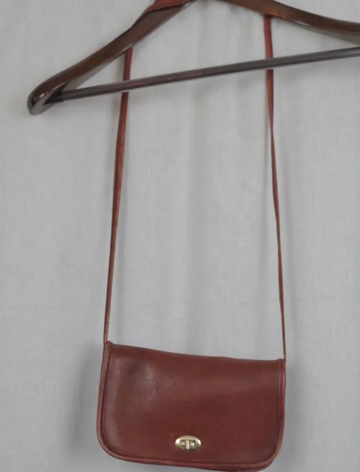 This listing is for a small unbranded Hong Kong Made Purse. It is made of relatively nice quality leather in a cordovanish color with significant Coach Styling cues. This bag has some fading/discoloration but is in good clean condition with no rips. This is a small bag. Approximate Measurements from the outside: Strap Drop: 19" Bag Height: 5" Bag Width: 8.3" Bag Depth: 1.4"