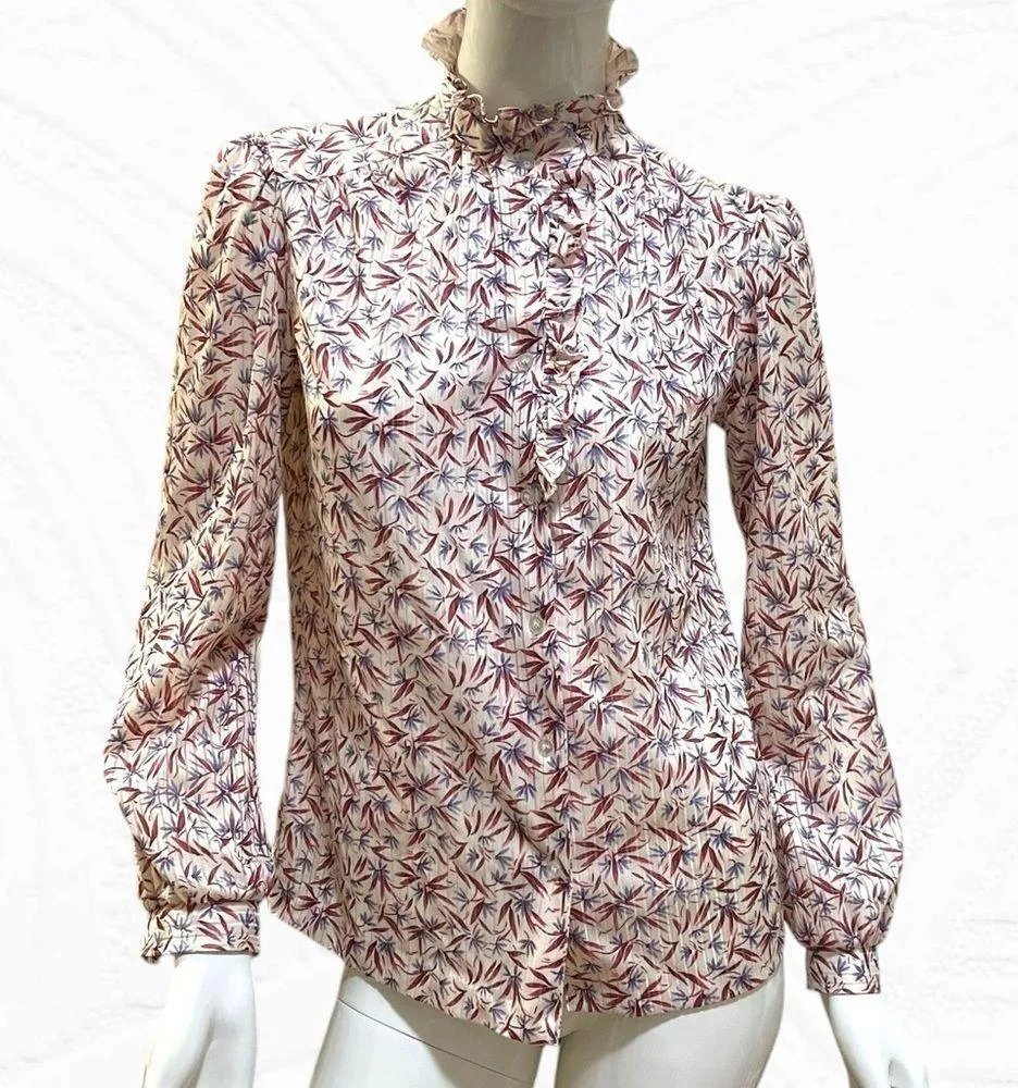 Vintage 70s High Collar Ruffle Long Sleeve Shirt Victorian look with a cottage core flair High collar design Ruffles all around top of the collar Ruffles continue 1/3 down the front of blouse Buttons down front for closure Print are burgundy red leaves with purple and lavender flowers. Floral print sits upon an ivory vertical stripe design. Slight puff sleeve Long sleeves Button cuffs at sleeves Label: Fire Island Material: A soft nylon polyester blend Approximate Measurements Laid Flat: Pit to Pit: 18” Waist: 18” Hips: 18” Sleeve Length: 24” Length: 24” Condition is excellent No flaws