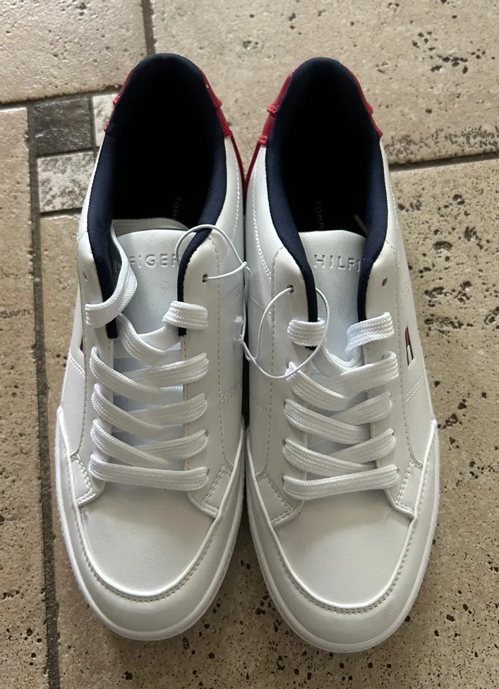 Sleek white sneakers with navy accents. Classic Tommy Hilfiger style. Ideal for everyday wear.