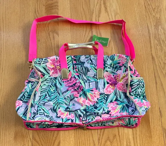 Colorful duffel bag featuring a vibrant floral pattern. Equipped with bright pink straps and gold ac... Show more