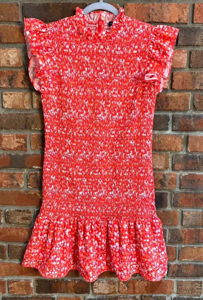 French Connection womens smocked high neck drop waist ruffles mini dress red/orange M