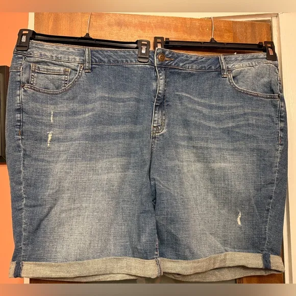 Venezia Woman’s Plus Bermuda Roll Hem Med Wash Denim Shorts Size: 26W New w tags 98% cotton / 2% spandex Distressed look Button and zipper closure Rolled hem 5 pocket design Pet and smoke free home