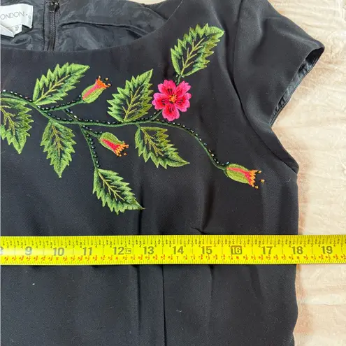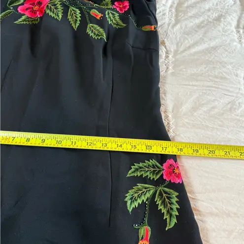Chic black mini dress with vibrant red floral accents. Perfect for stylish outings. Pre owned 54in... Show more