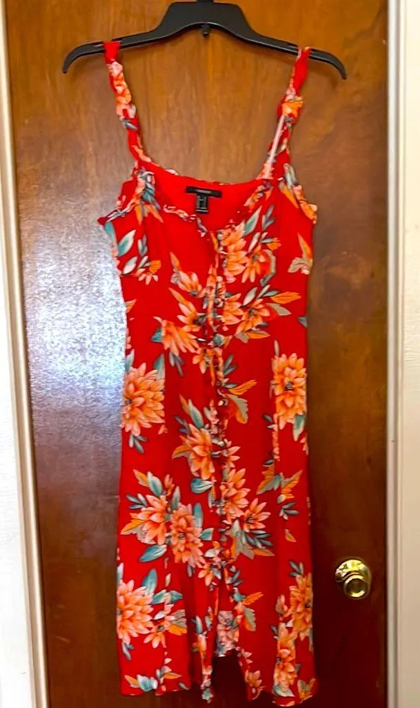 This sleeveless sundress from Forever 21 features a vibrant red base adorned with a charming floral... Show more