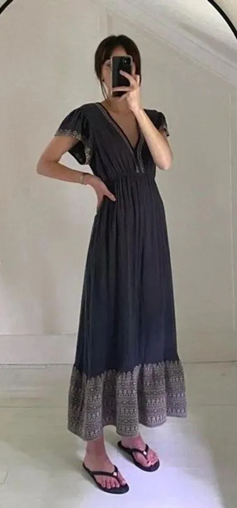M.A.B.E. grey-blue, solid, short sleeve, v neck, ‘Cella’ maxi dress in color, ‘Faded Black’. Cotton voile knit fabric construction with embroidery detailing at hem, placket & cuffs. Short ruffled flutter cap sleeves. Elasticized waist with ruched detailing. Relaxed fit, maxi-length, a-line silhouette. Pullover styling. Excellent condition. 100% cotton Bust: 39” Length: 50” --- E5062