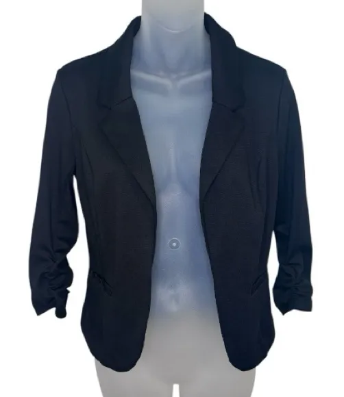 Candies Black 3/4 Sleeve Blazer Size Medium EUC Features lace detail lapels and ruched sleeves.